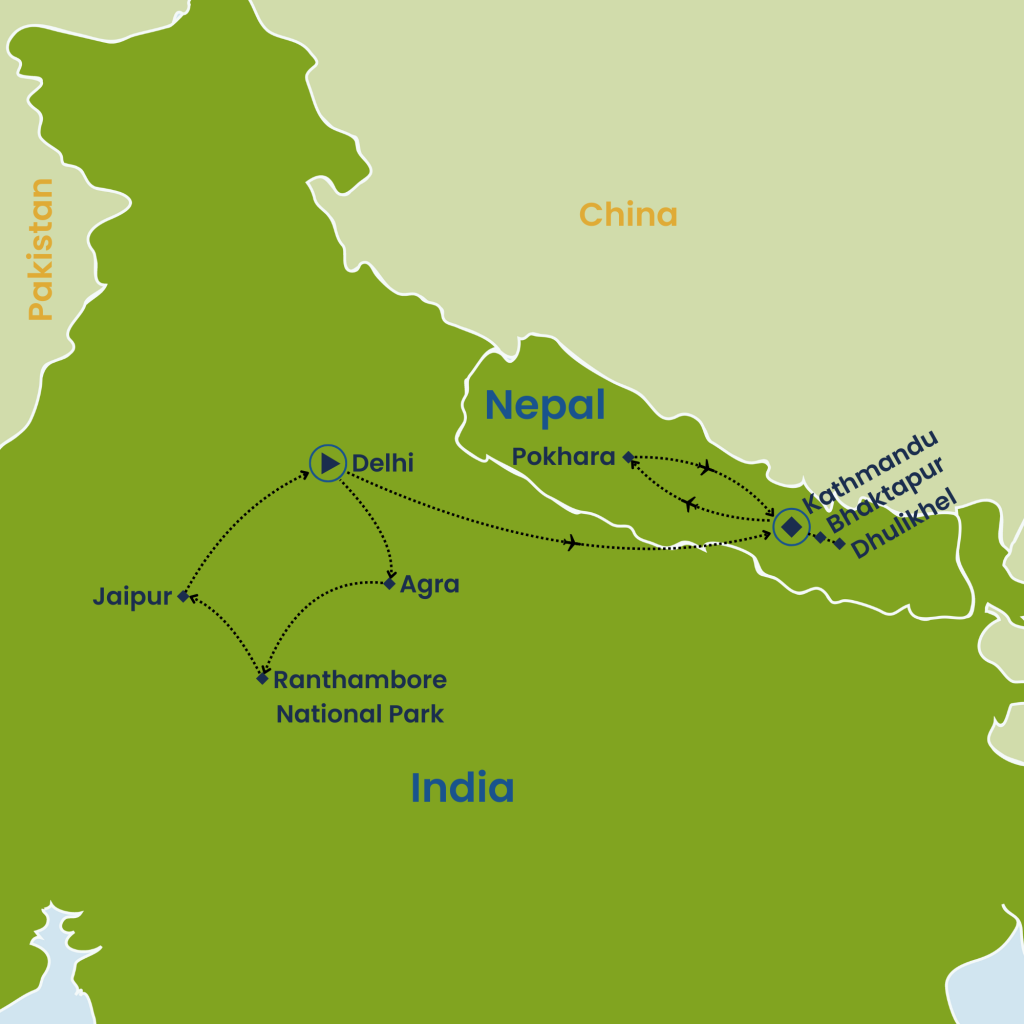 Embark on a 16-day journey through India and Nepal, blending history, wildlife, and Himalayan beauty. Begin in Delhi with its Mughal forts, bustling bazaars, and colonial landmarks before traveling to Agra to marvel at the Taj Mahal. Continue to Ranthambore for thrilling tiger safaris and artisan visits, then to Jaipur’s Pink City with its Amber Fort, lively bazaars, and cultural encounters. Fly to Nepal, where Dhulikhel offers Himalayan panoramas and village walks. Explore Kathmandu’s UNESCO sites, ancient temples, and unique Living Goddess traditions, then unwind in Pokhara with serene lakes, mountain views, and cultural treasures. A rich tapestry of heritage, wildlife, and breathtaking landscapes awaits.