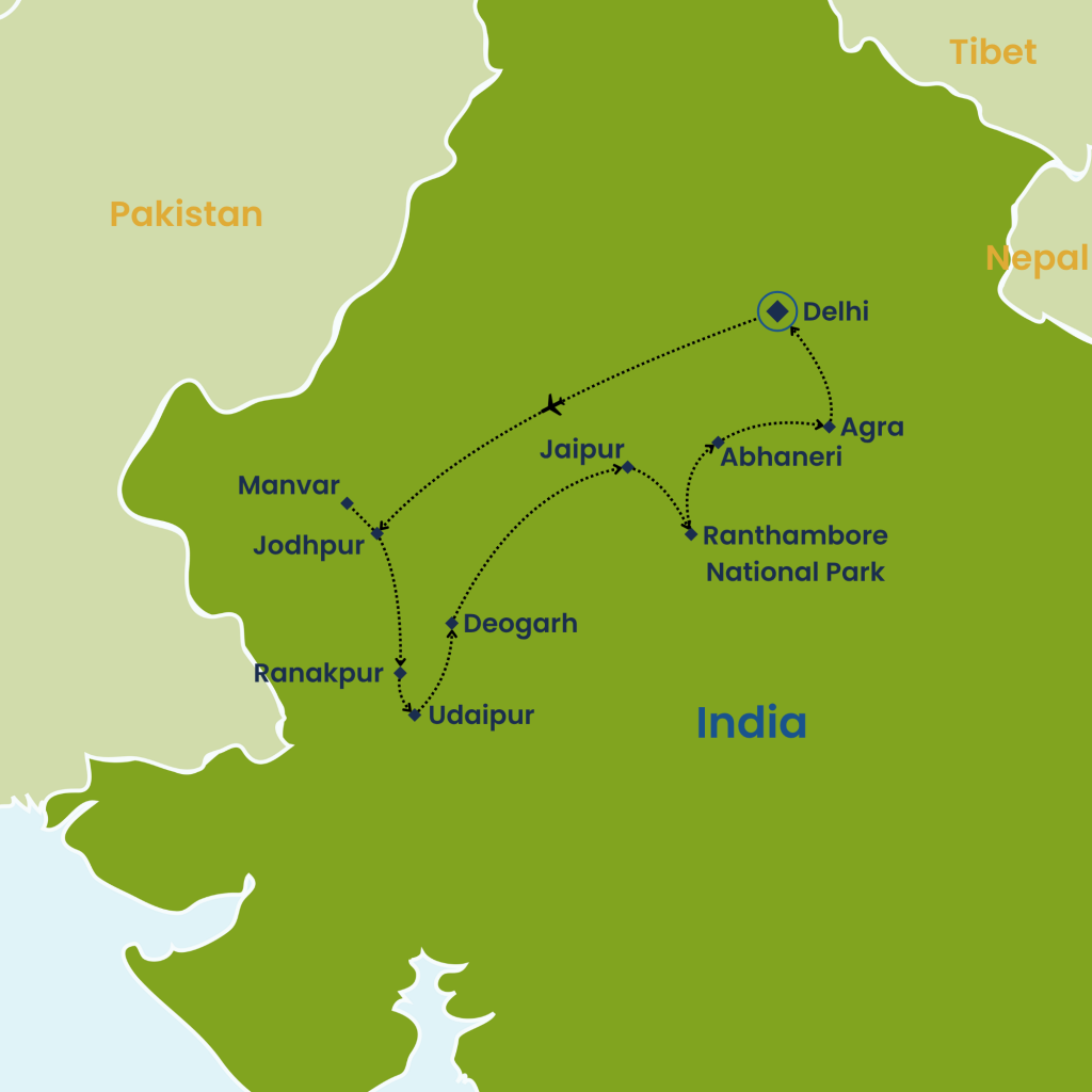 This journey explores India’s diverse cultural and historical heritage across key locations. In Delhi, witness the blend of ancient and modern with sites like Red Fort, Jama Masjid, and Humayun’s Tomb. Manvar in the Thar Desert offers desert life and camel rides. Jodhpur, the “Blue City” is known for Mehrangarh Fort and vibrant markets. Udaipur, the “City of Lakes,” charms with City Palace and serene Lake Pichola. Deogarh provides rural experiences and heritage stays. Jaipur, the “Pink City,” showcases Amber Fort, Hawa Mahal, and local culture. Ranthambore thrills with wildlife safaris. Finally, Agra reveals Mughal grandeur at the Taj Mahal and Agra Fort.