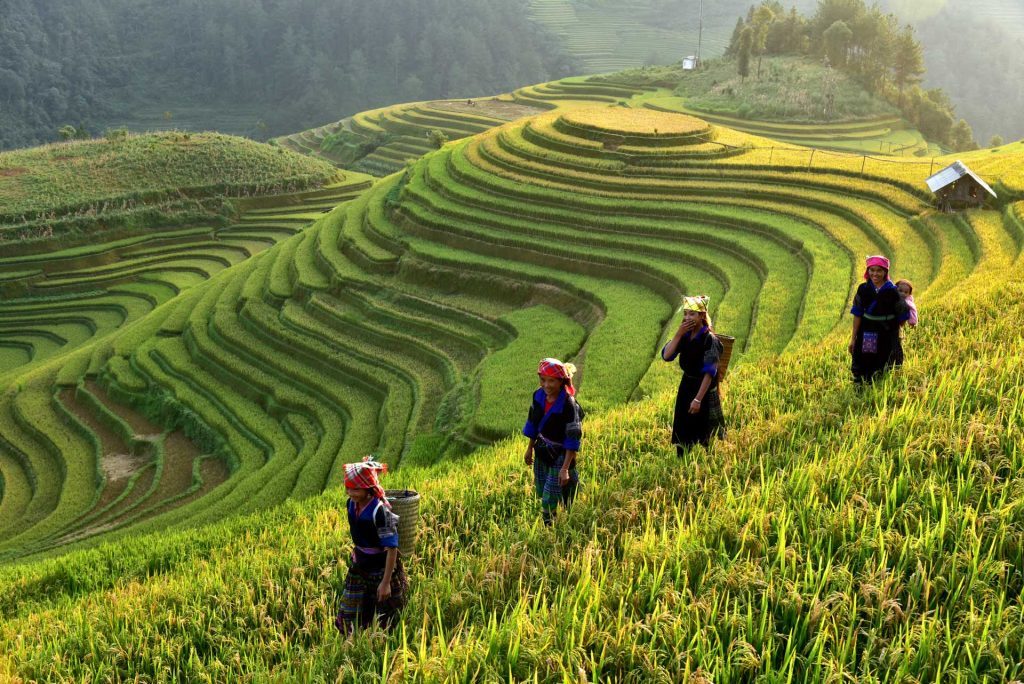 This morning, you will be met at your hotel in Sapa by local guide and driver for a short road transfer heading northwards of Sapa along national road 4C to O Quy Ho with several stops for magnificent landscapes of Fansipan, Sin Chai valley and especially amazing flower and vegetable farms . Then turn right to follow a narrow road for half an hour getting through the wild region with thick rain forest covering walled-up mountains, passing several waterfalls before arriving to Ban Khoang, a village of the Red Zao ethnic peoples who live their unique way of life and well maintain their traditional values. The village looks prosperous thanks to the combination of wet rice cultivation on the terraced fields with cardamom farming under the shade of trees in thick forest. Spend over an hour walking to explore this remote village for a brief understanding of local life. Leaving Ban Khoang and process along the road for about 10km to Ta Giang Phinh valley inhabited by the Black Hmong who live in some small villages scattering along a peaceful stream. Enjoy an hour lunch break on the bank of a stream before walking along village path which connects village to village to witness daily activities of local life such as plough and harrow the fields, growing, harvesting or doing some house work. In leisure months men often gather to build new houses or repair parts of old ones while women stay home making their traditional costumes. The walk ends in mid-afternoon, picked up for the road ride back to Sapa. Overnight in Sapa.